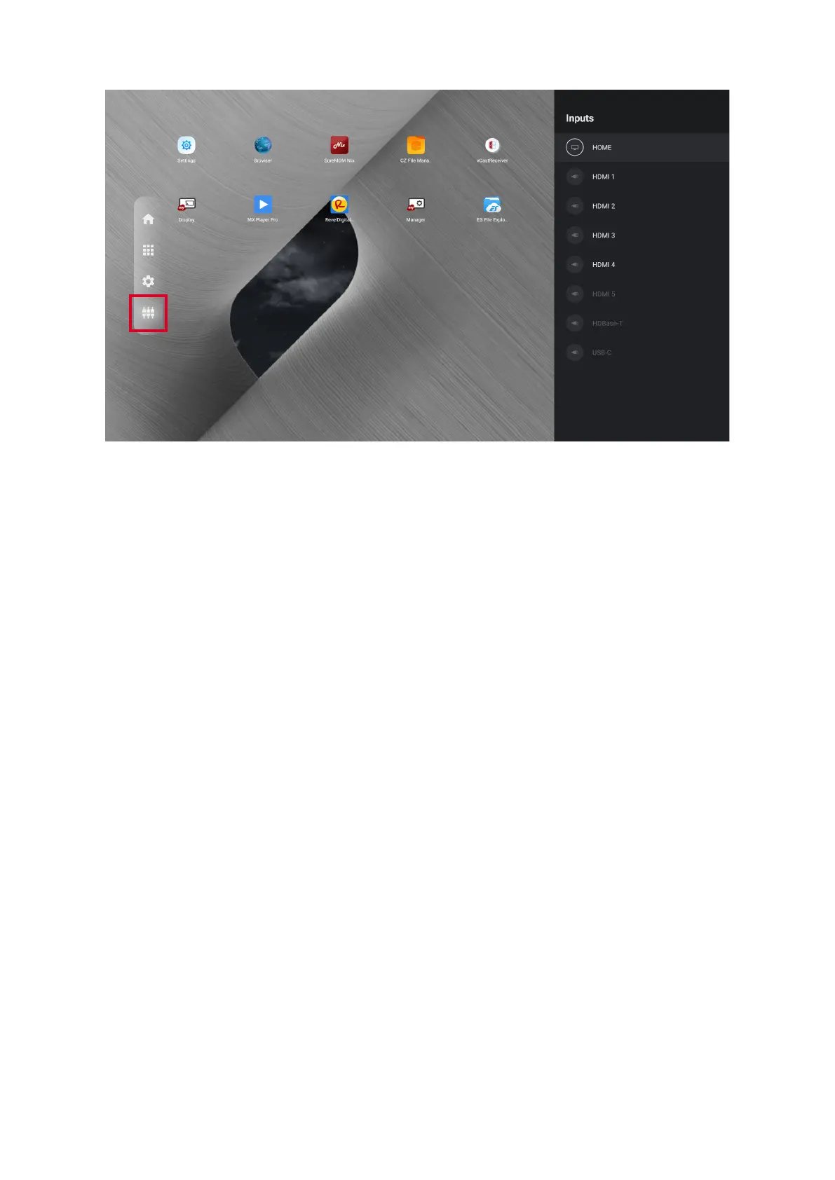 The display supports eight input sources: Home, HDMI 1, HDMI 2, HDMI 3, HDMI 4,