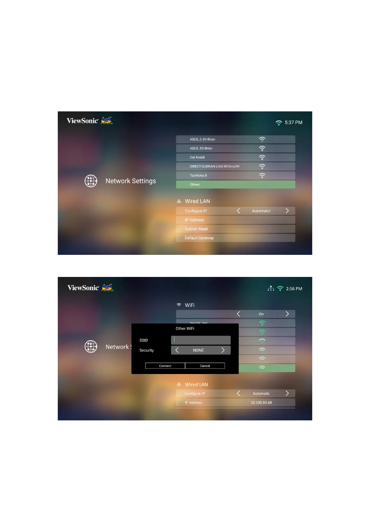 1. Ensure the Wi-Fi dongle is plugged into the projectors Wi-Fi dongle socket.
