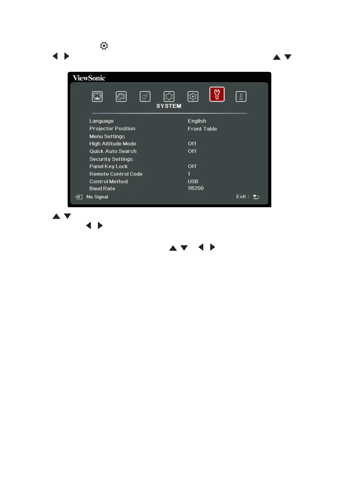 2. Press / to select the SYSTEM menu. Then press ENTER/OK or use / to