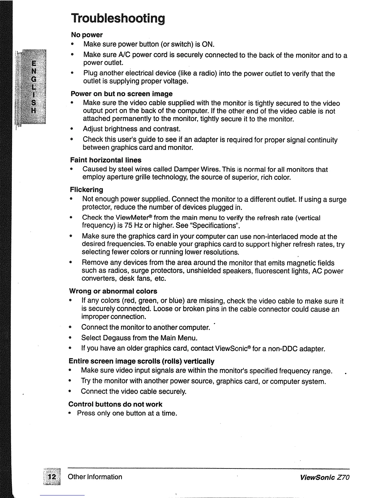ViewSonic Z70 - Troubleshooting; No Power Issues; No Screen Image; Flickering Issues