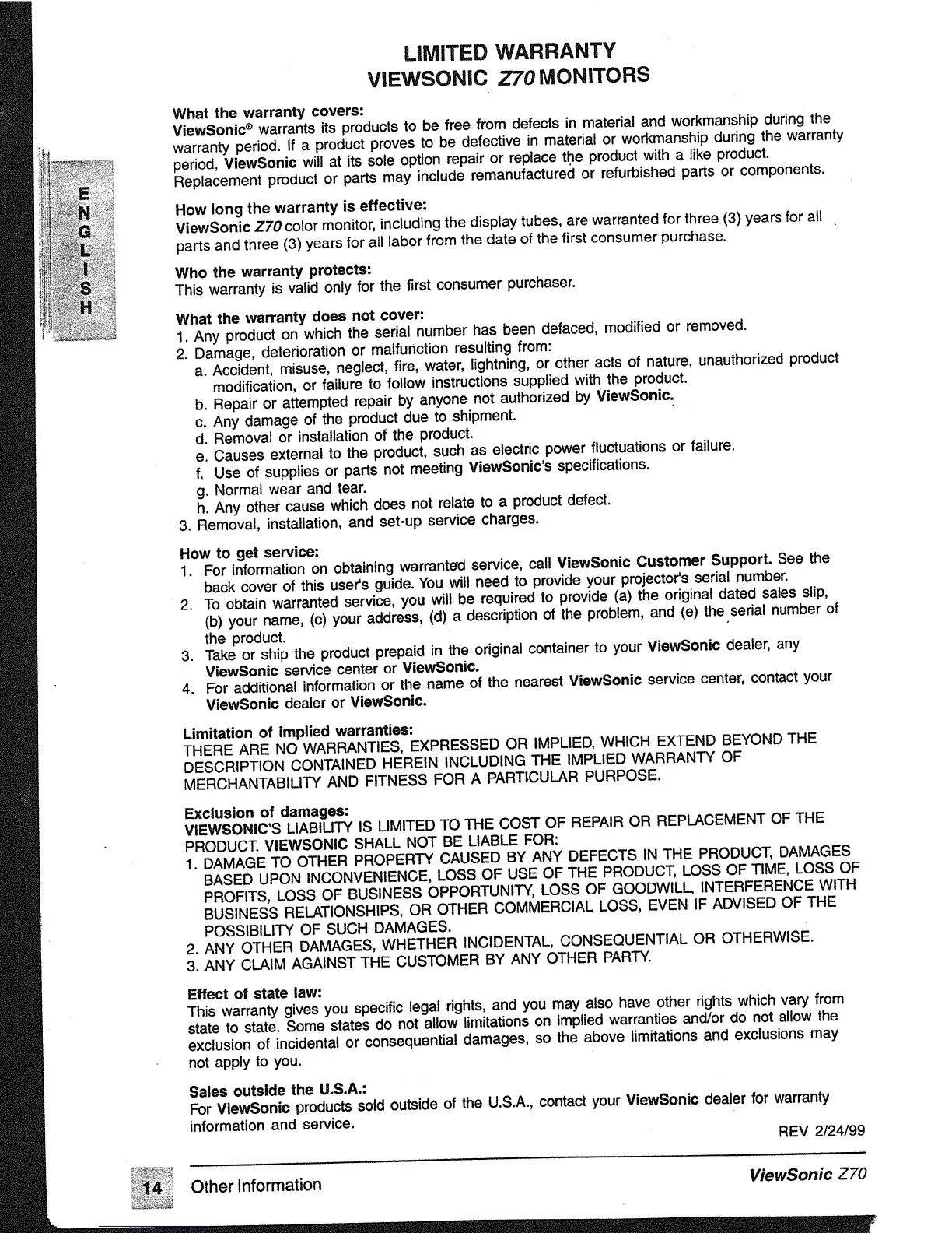 ViewSonic Z70 - LIMITED WARRANTY; How to Get Service