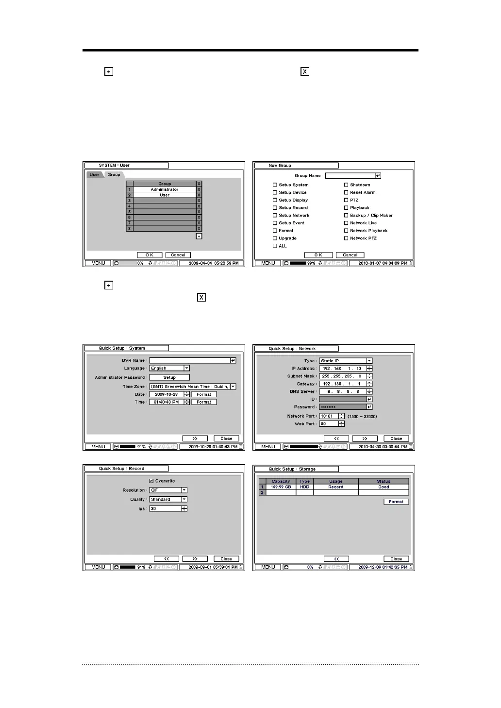 Set user registration and access rights for the system. Press Group tap to add and set group.