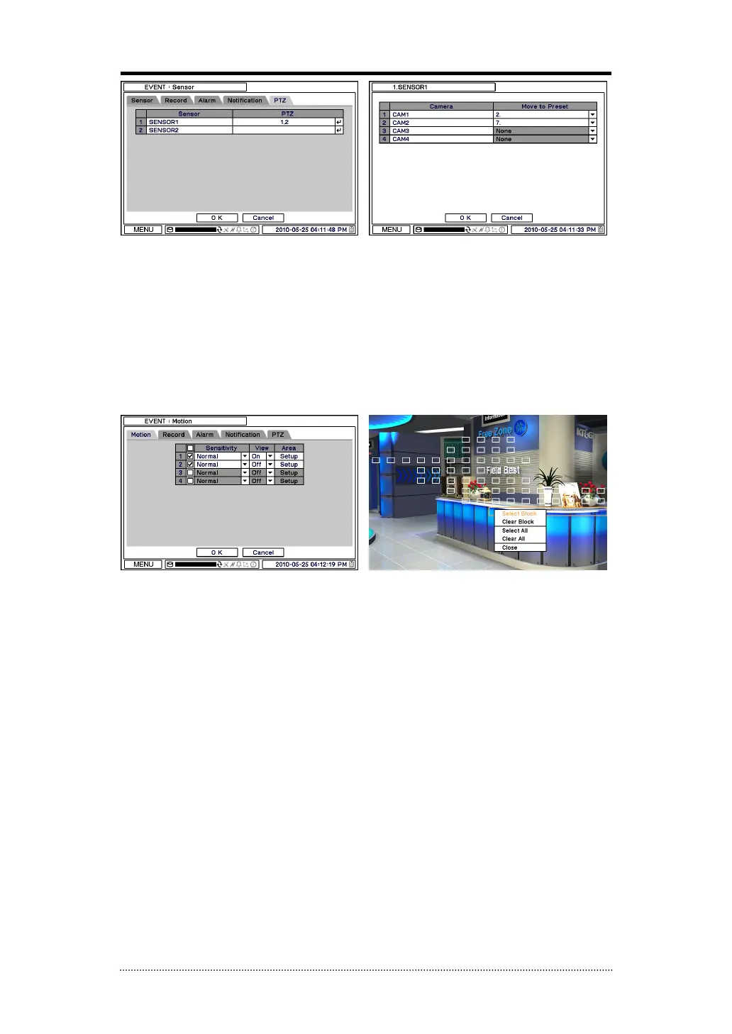 cameras 1,2. If you click PTZ section, PTZ preset (position) can be set for cameras in the event of