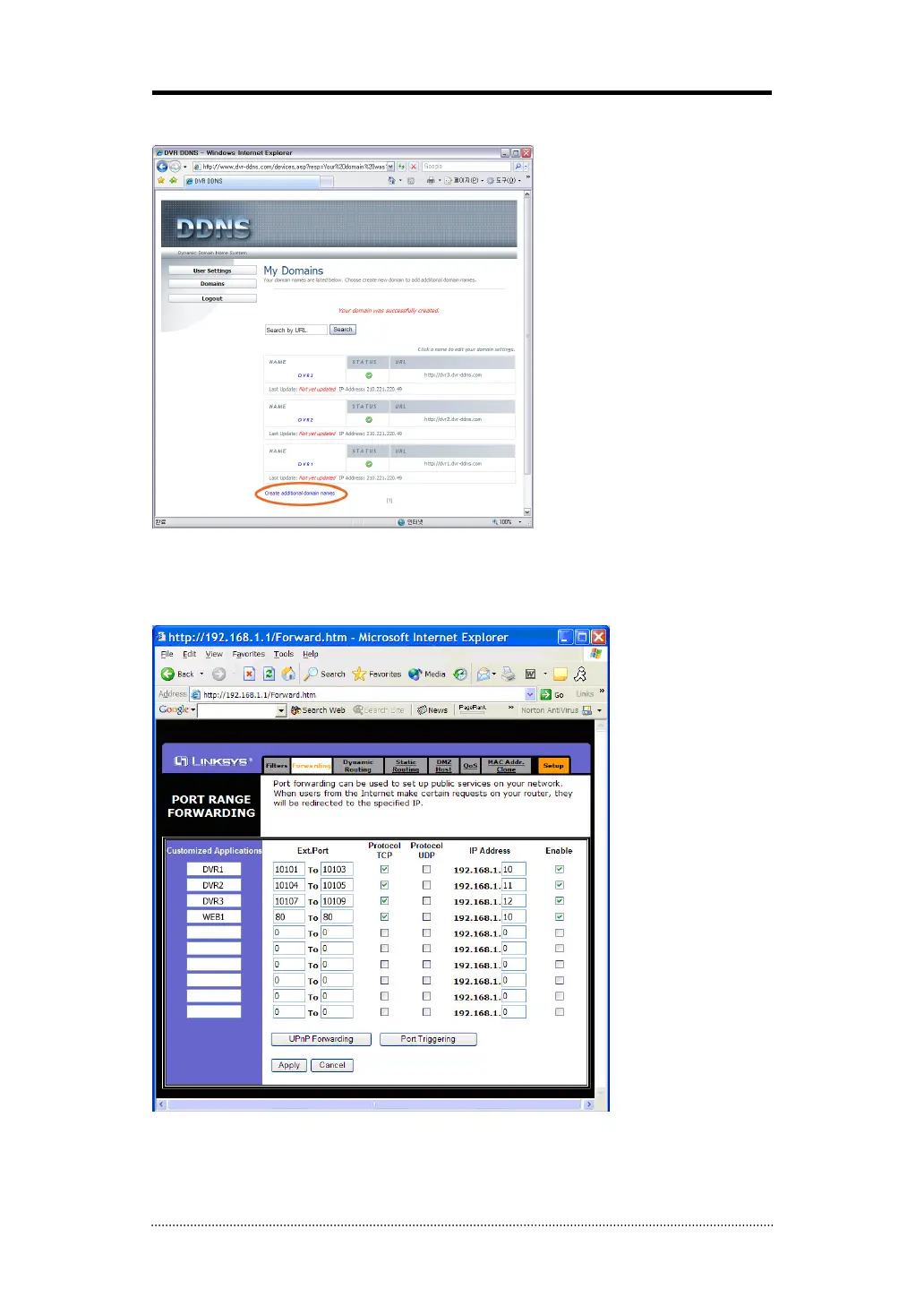 - Please insert the IP address and Port number for DVR in the Port Forward menu.