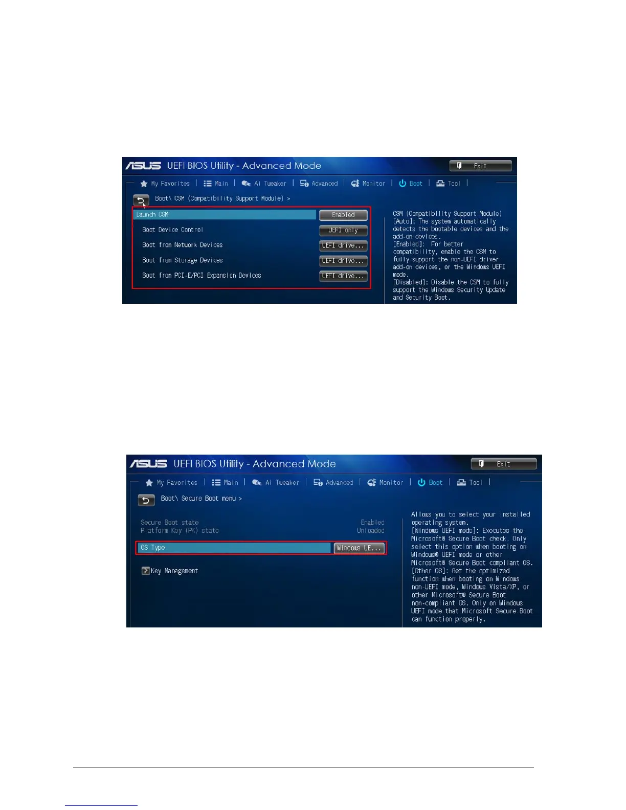 4. In the CSM (Compatibility Support Module) change following settings for Windows 8/8.1.