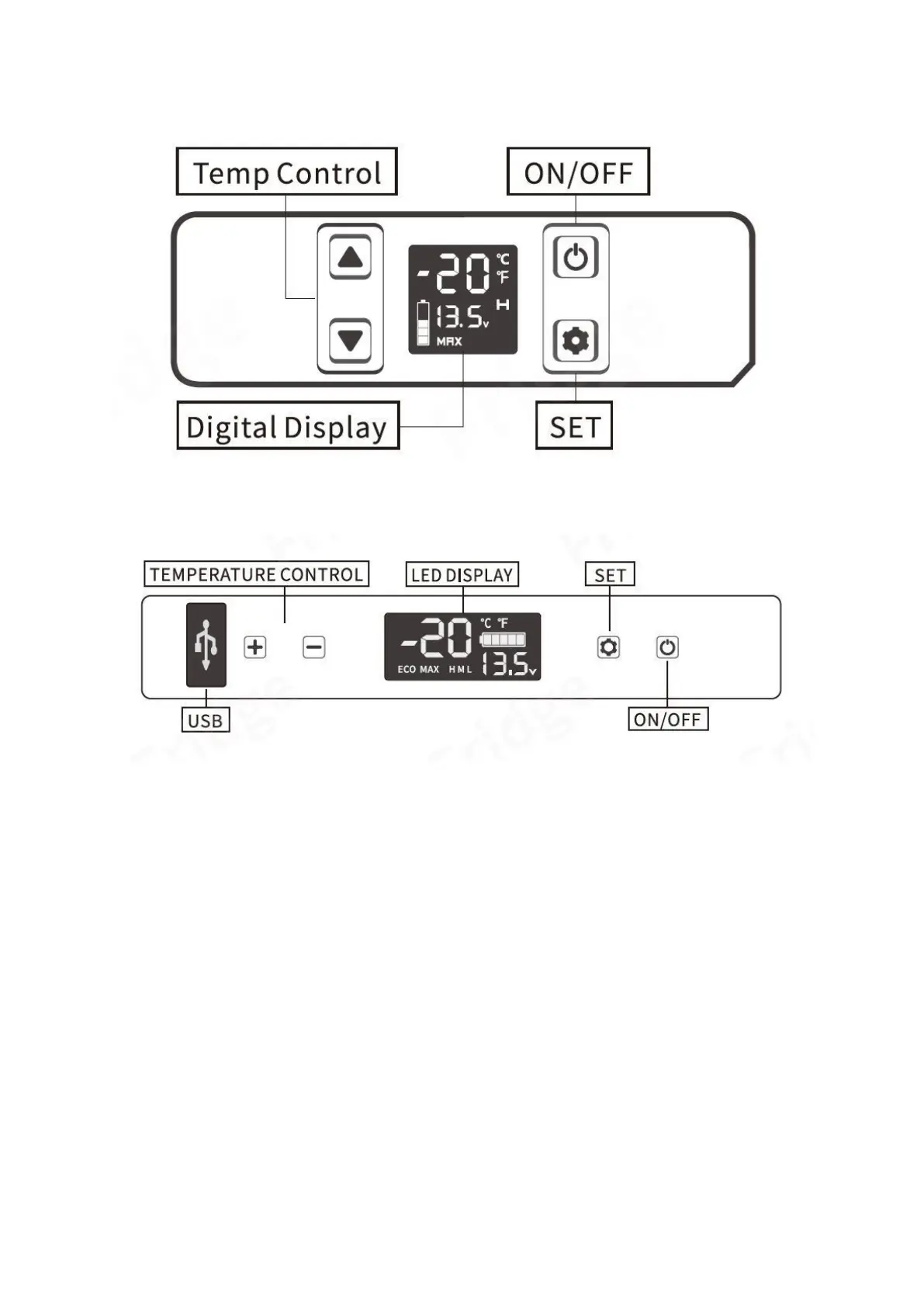 The "SET" button allows you to select the temperature value, temperature units, cooling rate
