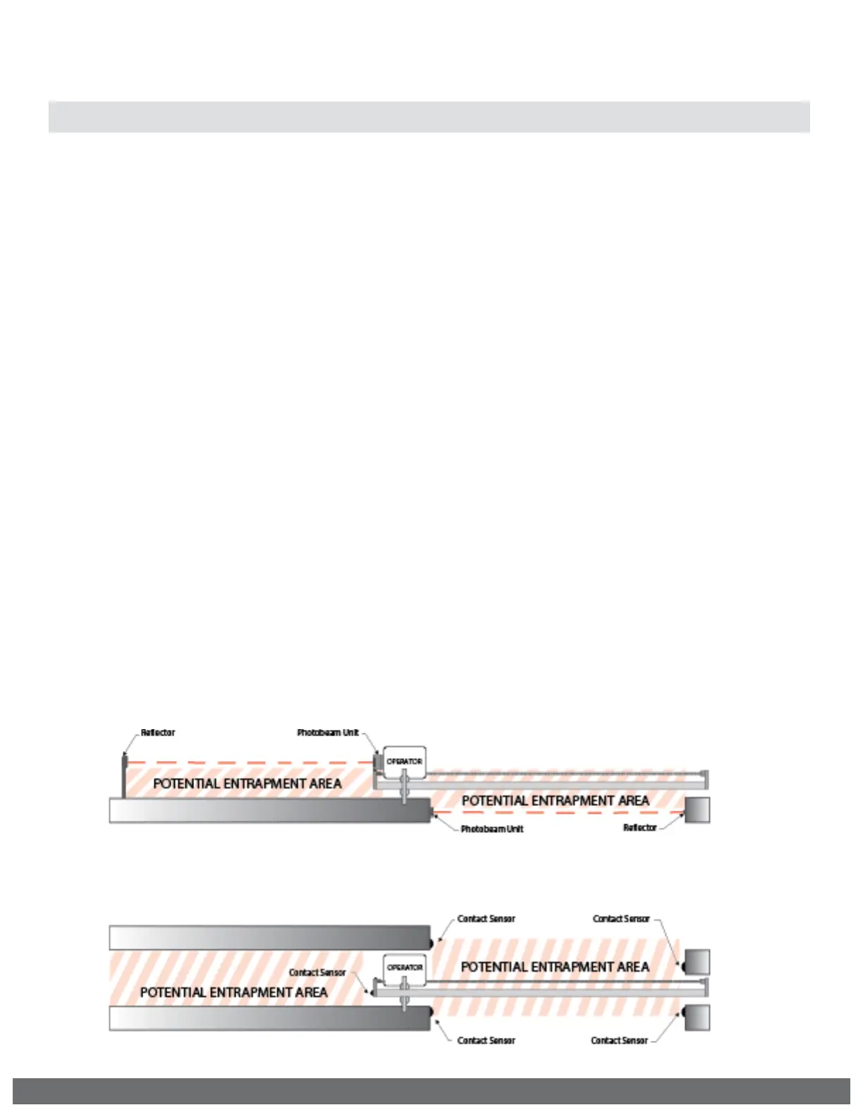 For Slide Gate Operators, a minimum of two monitored entrapment sensors are required to