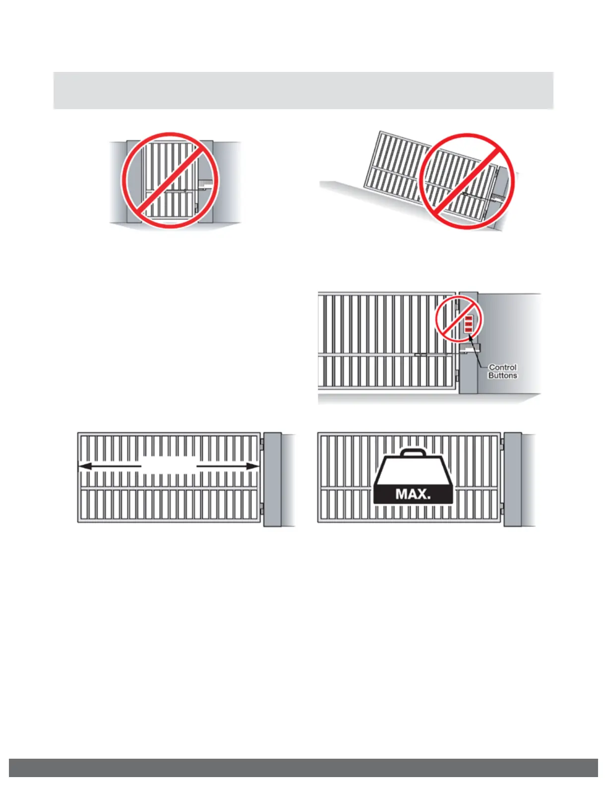 DO NOT allow pedestrian use of this gate DO NOT install the gate operator to lift gates