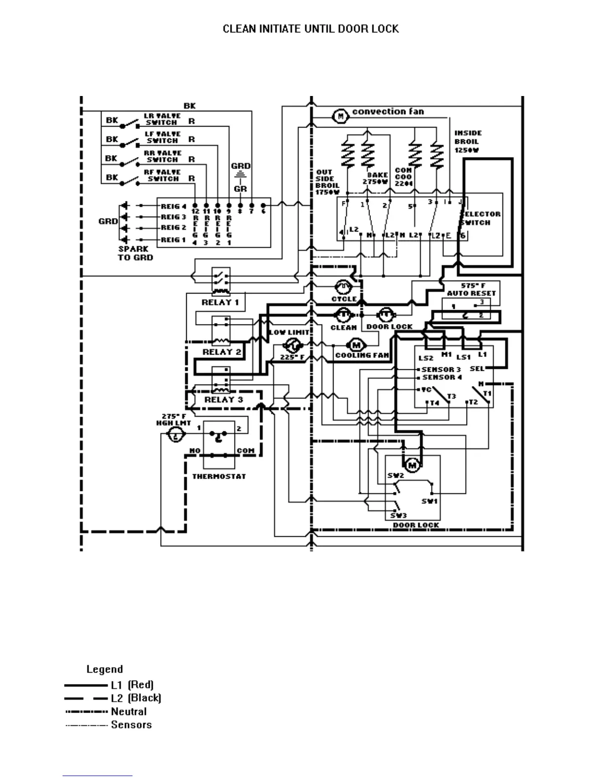 Selector Clean position closes Heating Element circuits 4-F, 1-N, 2-L2, 3-L2 and Door Lock Module / Timer circuit