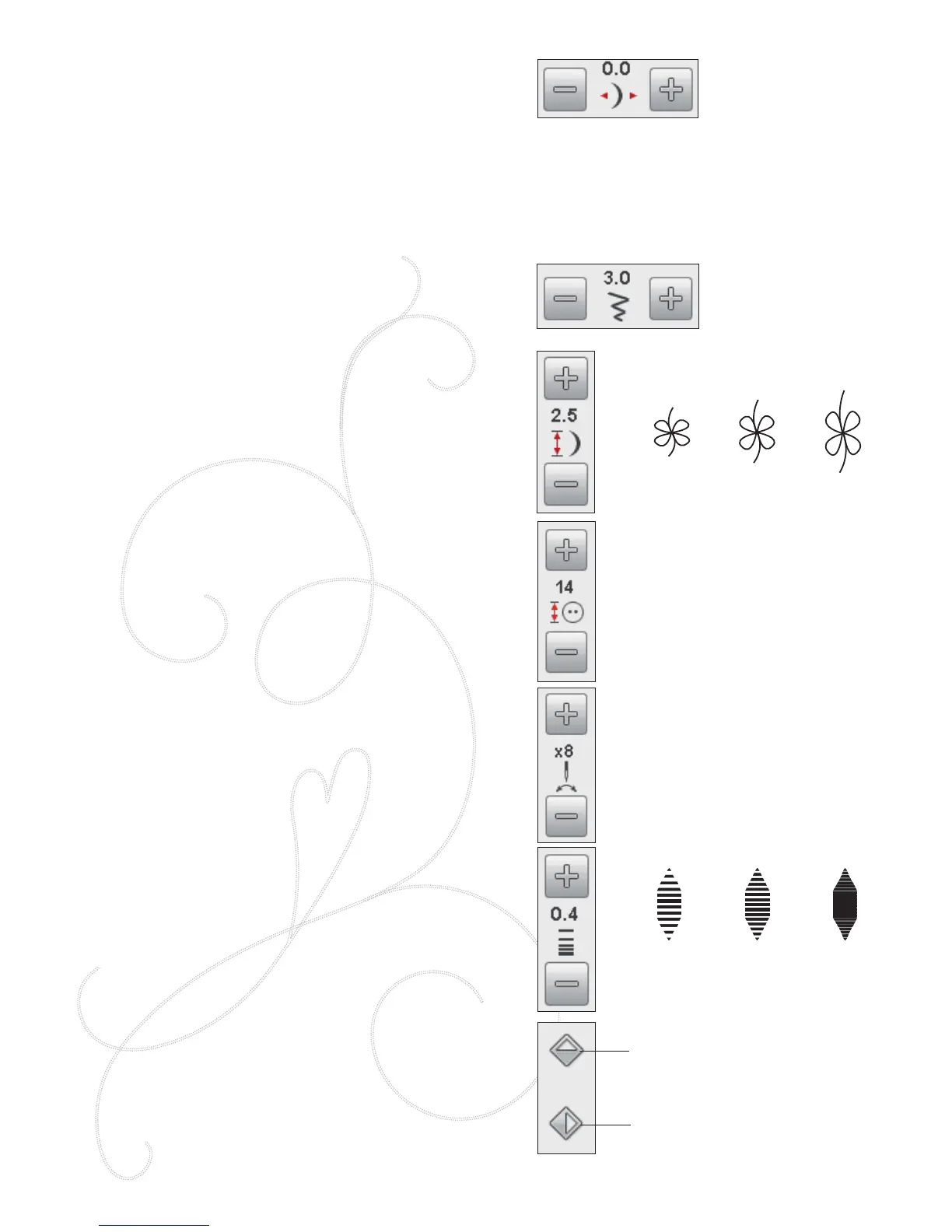Note: The set stitch width and the stitch length are shown between the + and -.