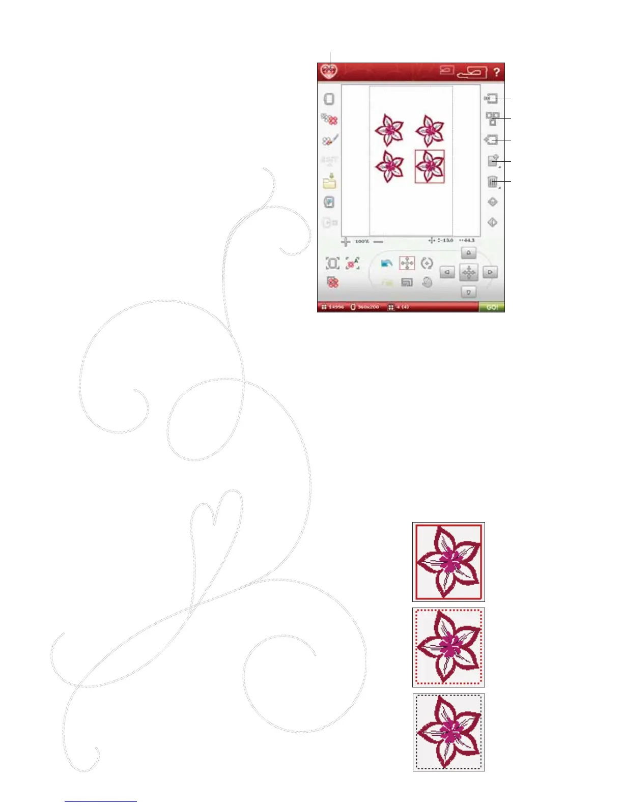 2. Marked and Selected - The design is marked with a dotted red line. You are