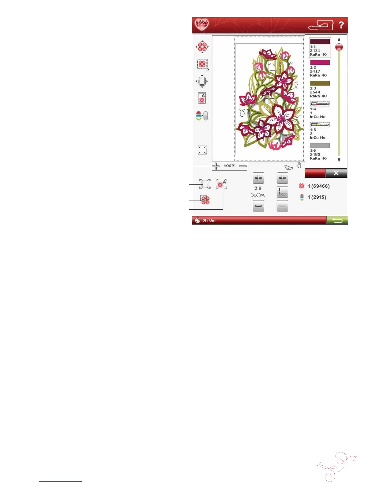 Use to zoom in or out of the embroidery À eld. Use Zoom In