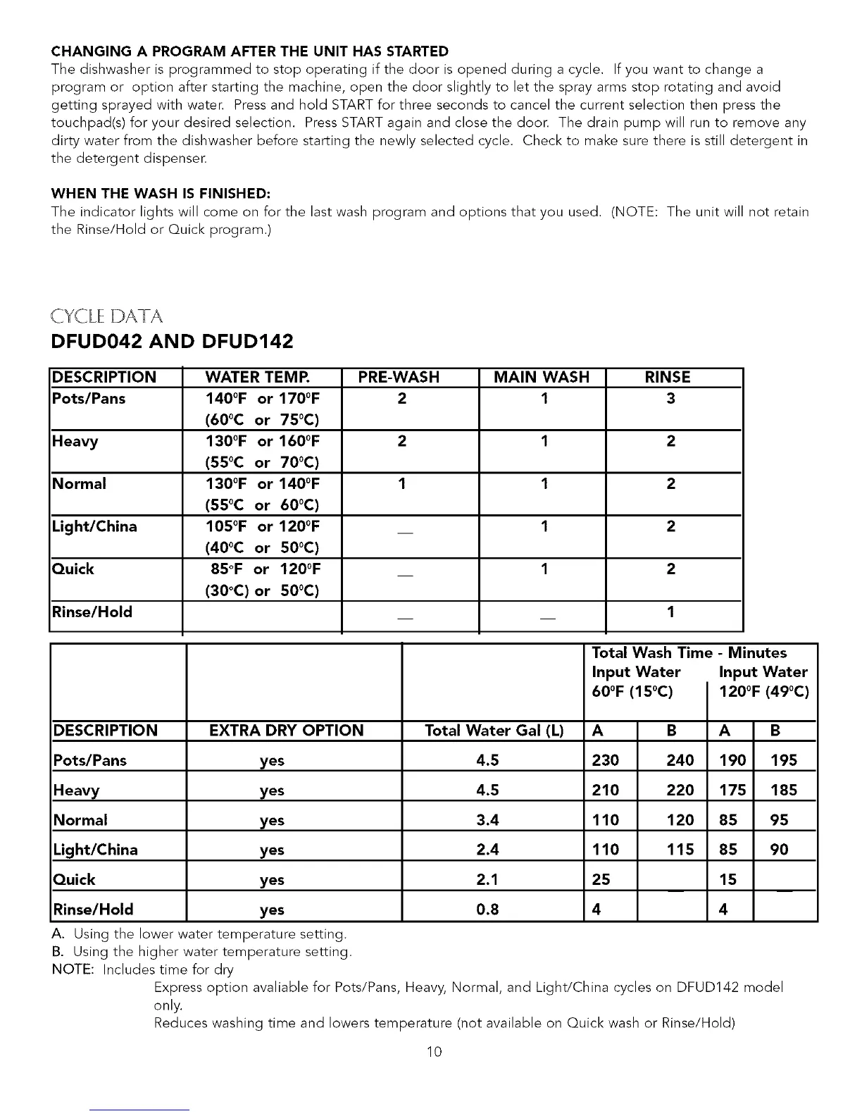 Express option available for Pots/Pans, Heavy, Normal, and Light/China cycles on DFUD142 model