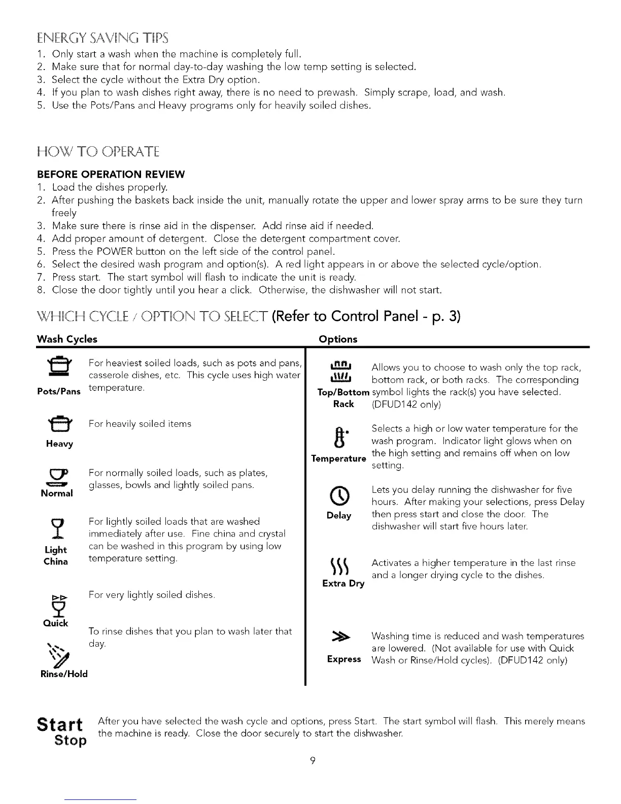 IHIIICH CYCILIE/ OIPTIION TO SIEILIECT(Refer to Control Panel - p. 3)