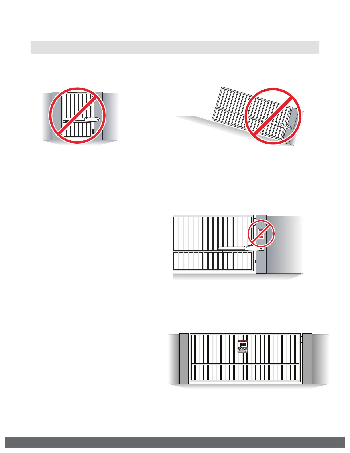 DO NOT allow pedestrian use of this gate DO NOT install the gate operator to lift gates