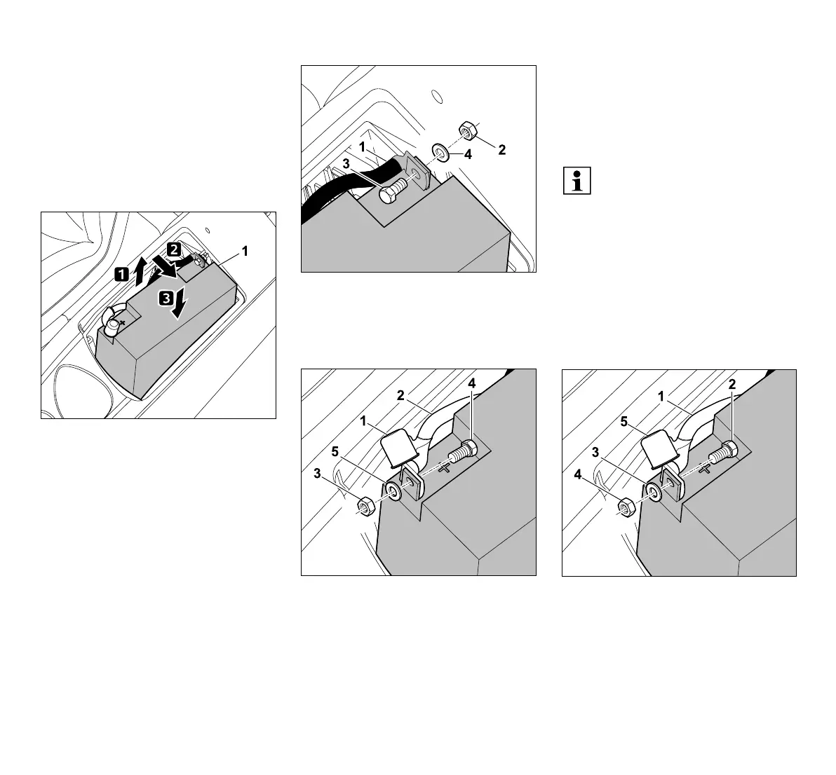 tornillo (2), la arandela (3) y la tuerca (4).