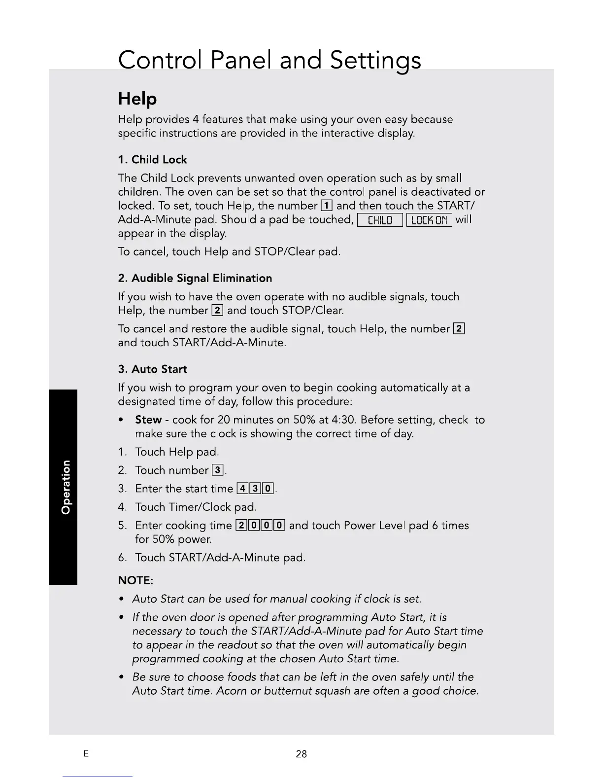 Viking RVM320SS - Help; Child Lock; Audible Signal Elimination; Auto Start