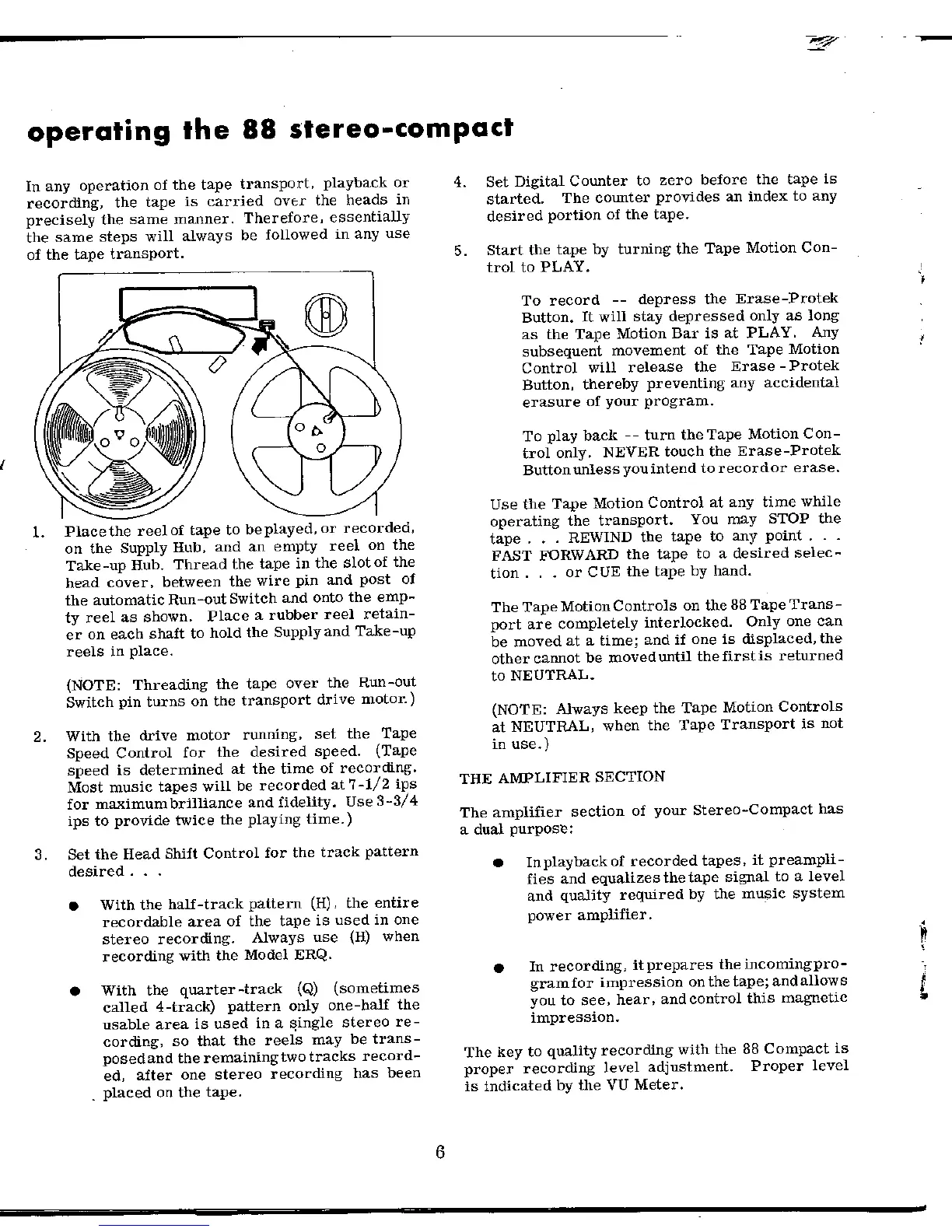 Viking Stereo-Compact 88 - Operating the 88 Stereo-Compact; Tape Threading and Transport Operation; Amplifier Section Functions