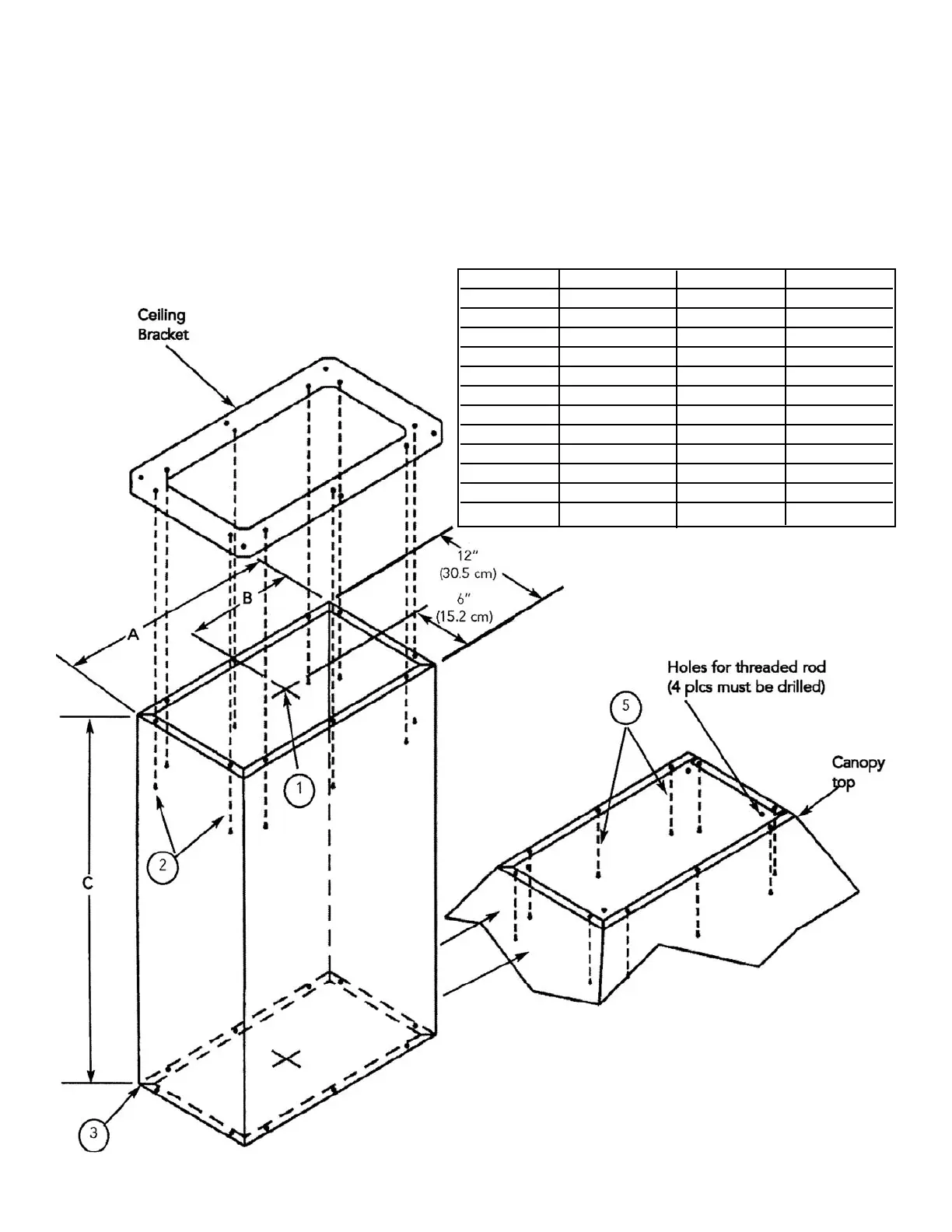 threaded rod from the ceiling to the top of the canopy at all four corners. Holes must be drilled.