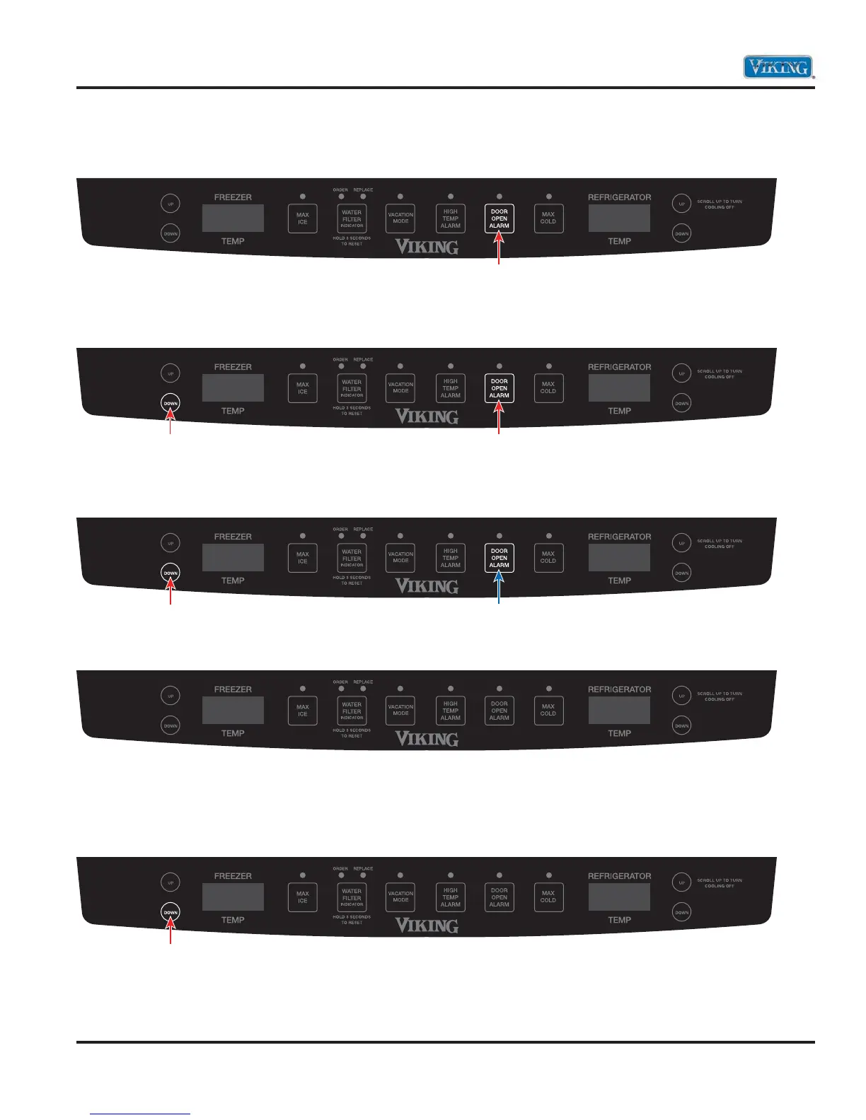 3. While still holding the freezer temperature “DOWN”, release the “DOOR ALARM” keypad and wait