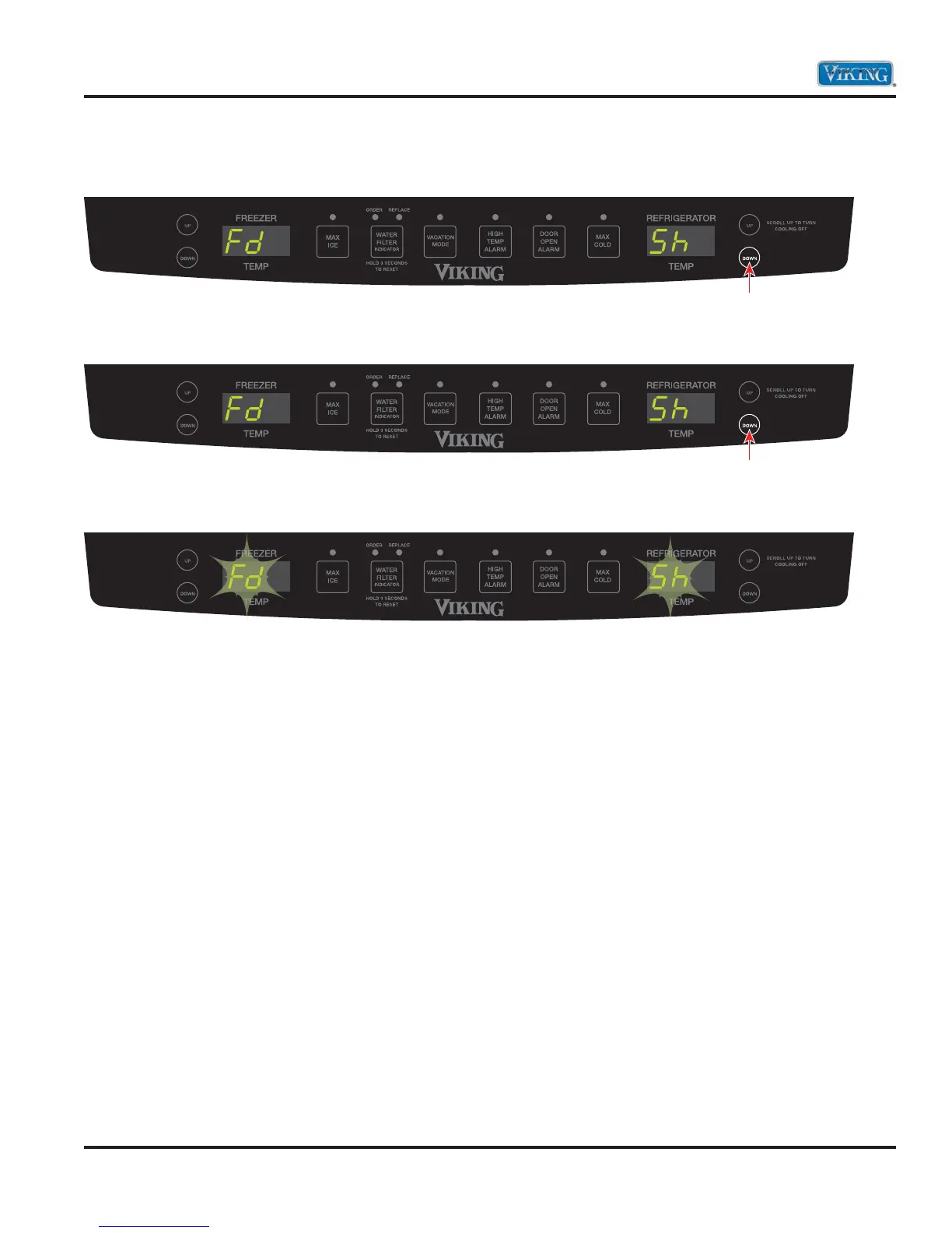 5. Press the refrigerator temperature “DOWN” keypad again. Sh appears in right display.