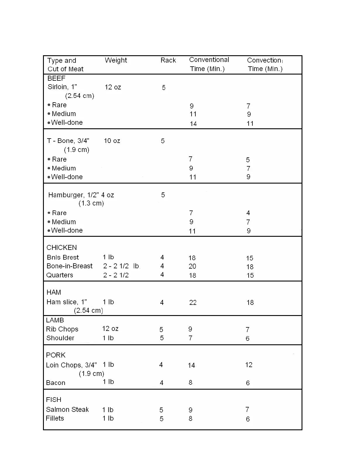 CONVENTIONAL/CONVECTION BROILING CHART