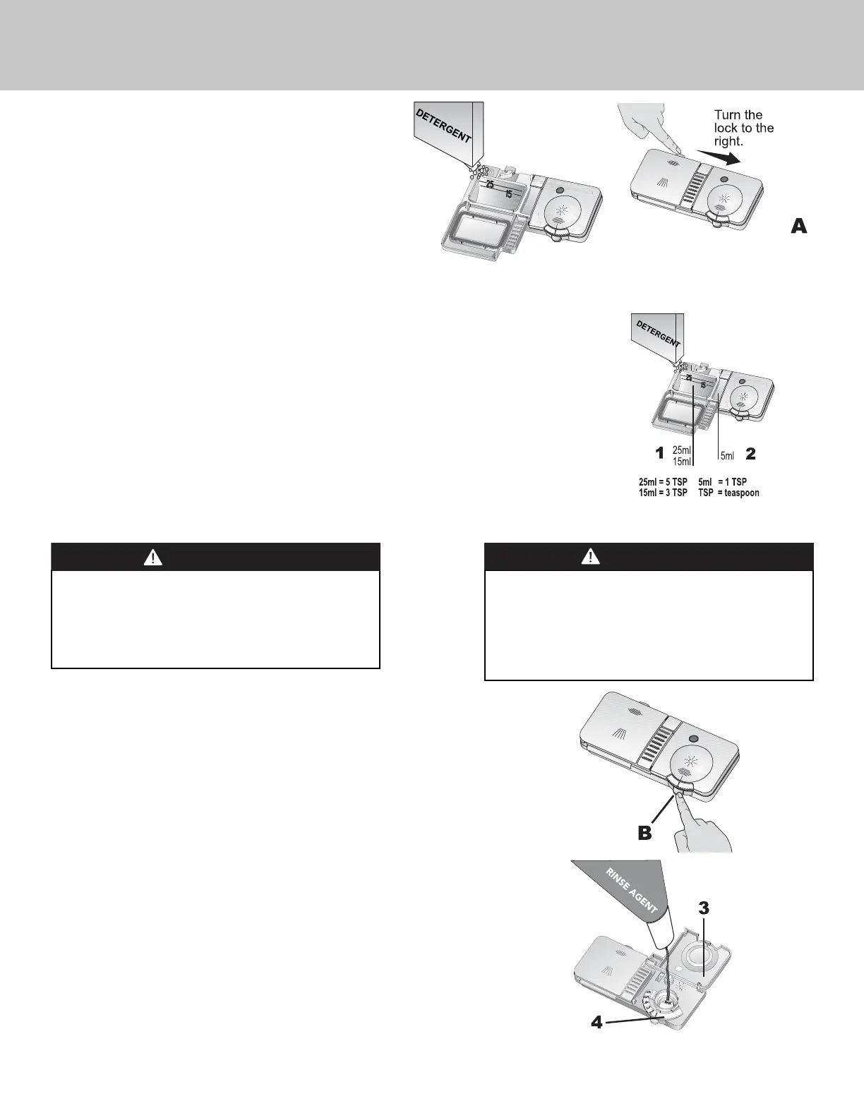 tsp. mark. When the dishes are less dirty, it is generally su cient to ll the detergent up to the 15 ml/3 tsp. mark.