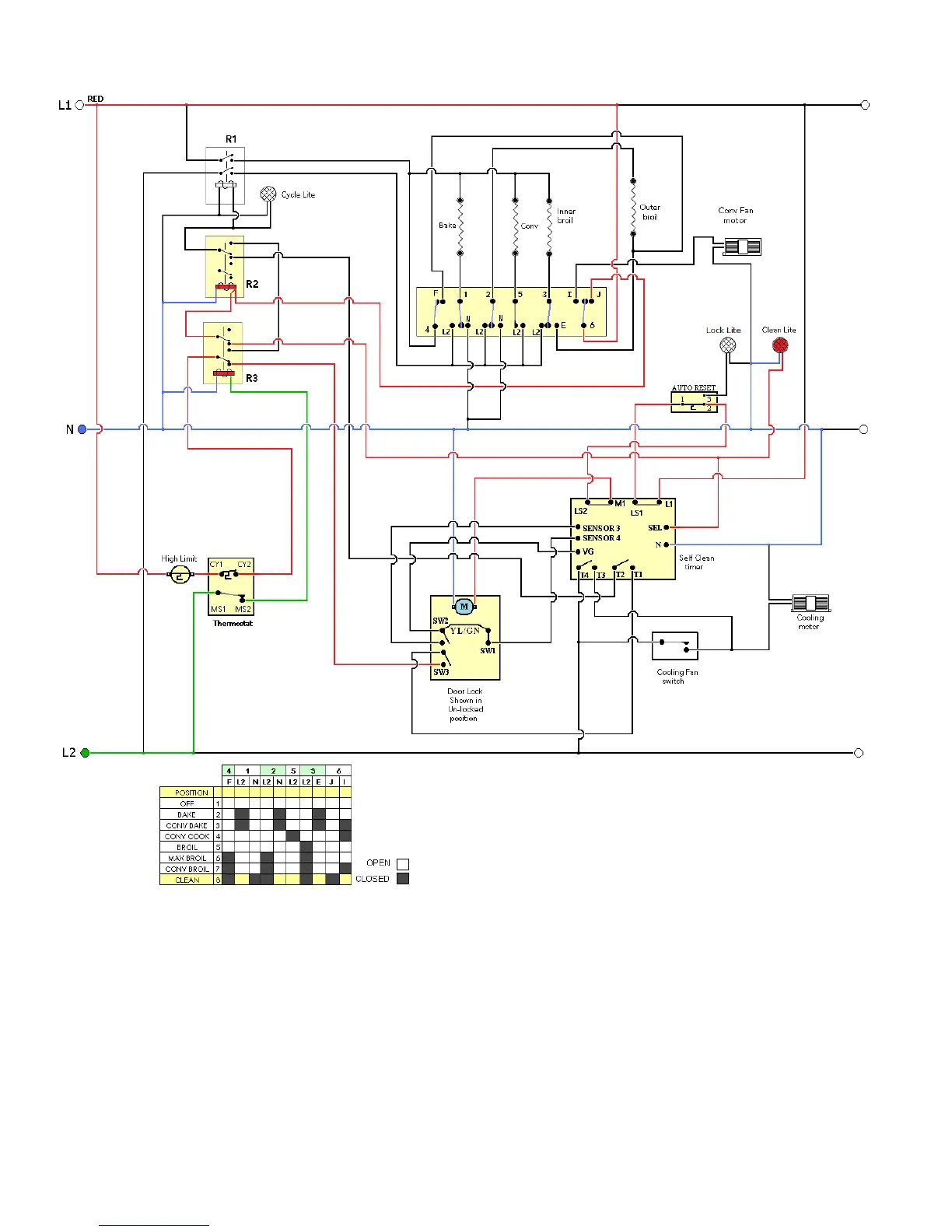 Selector Clean position closes Heating Element circuits 4-F, 1-N, 2-L2, 3-L2 and Door Lock