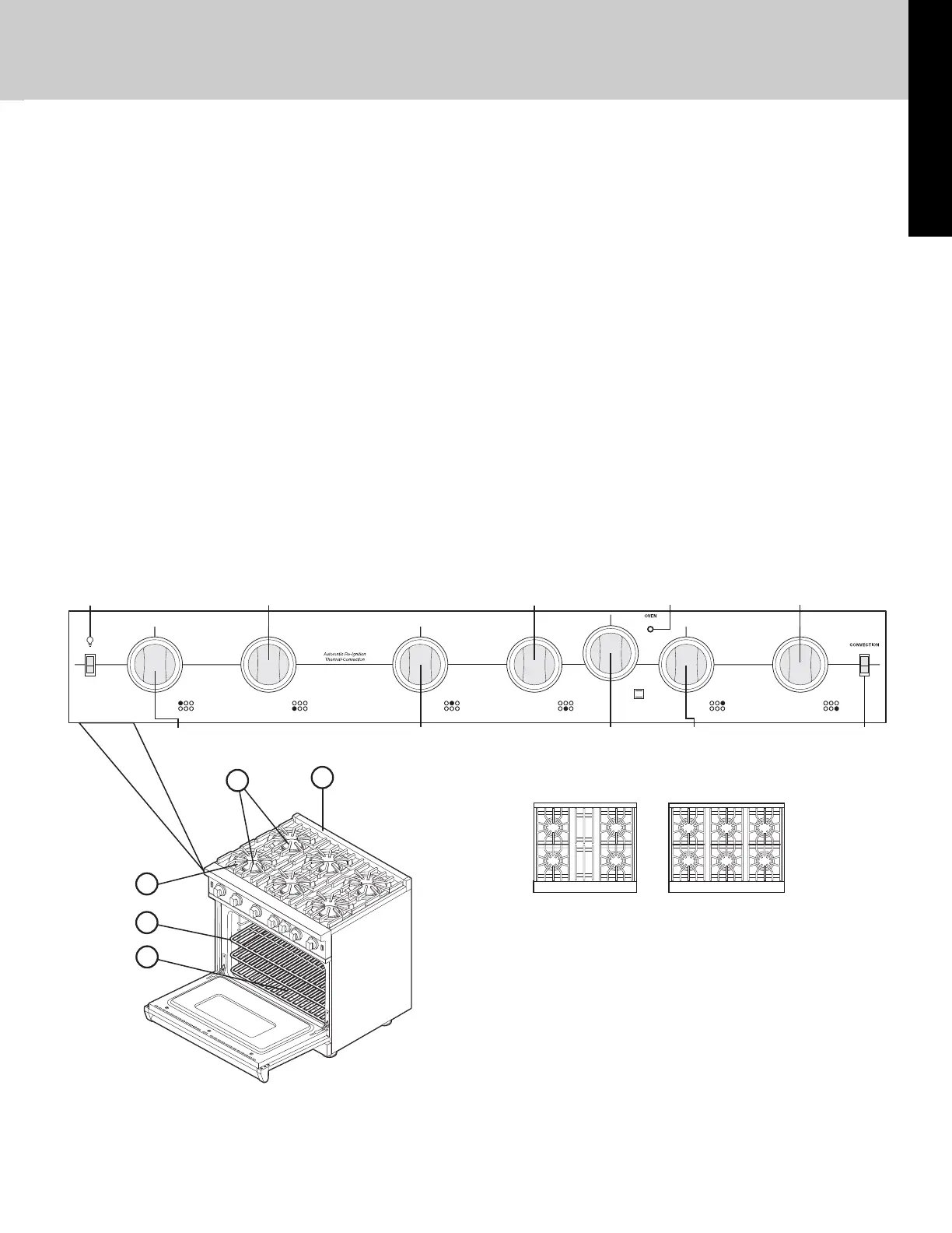 1. Six 15,000 BTU open burners with porcelain/