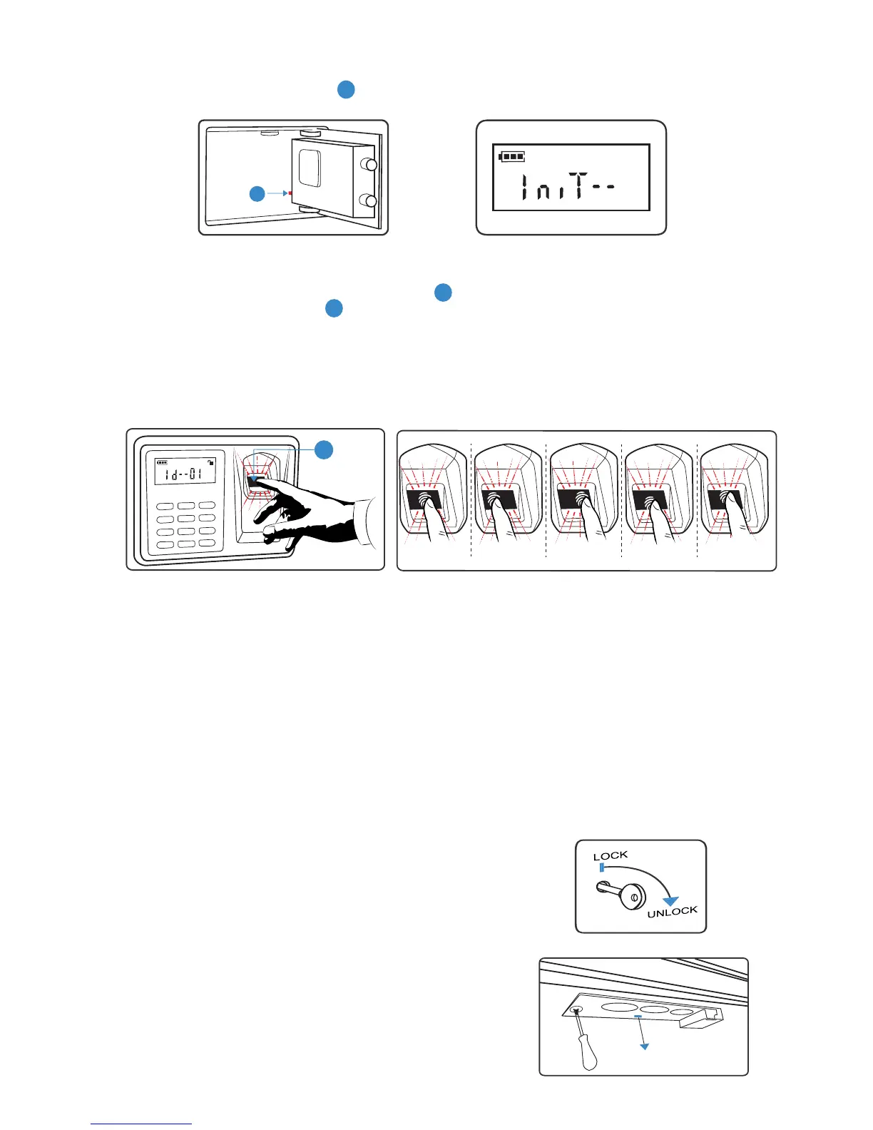 2.1. PRESS and HOLD down red button A for 10 seconds. “INIT” ashes on LCD display followed by “OK”. Safe is