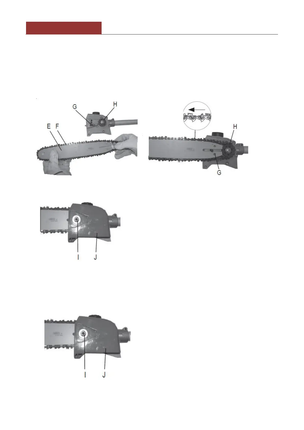 -Enlevez le capot de chaîne (J) en dévissant la vis de tension (I). Placez la chaîne (F) dans la rainure du guide