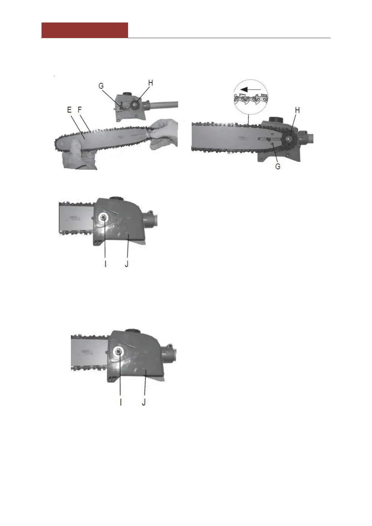 verižnika. Zatič za nastavitev napetosti verige se mora prilegati v utor na meču (G).