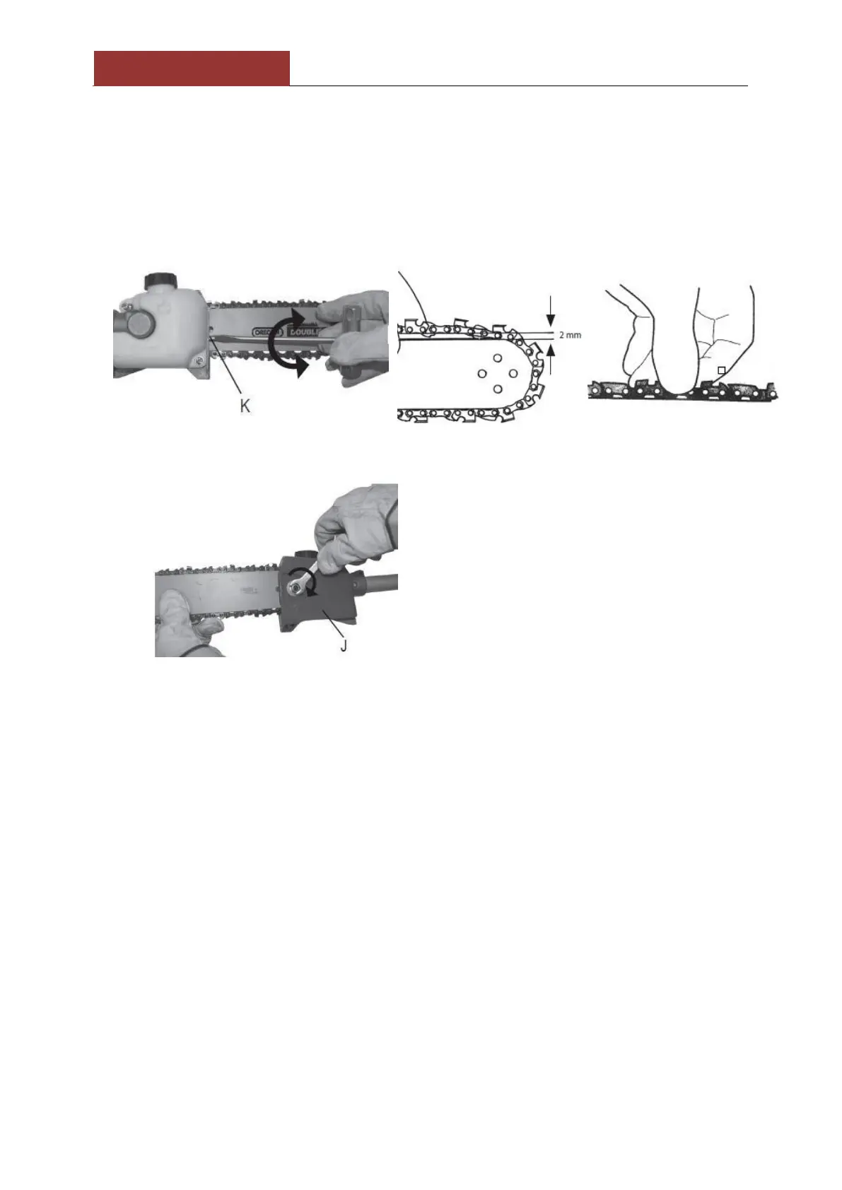 - Z vijakom za nastavitev napetosti verige (K) nastavite ustrezno napetost.