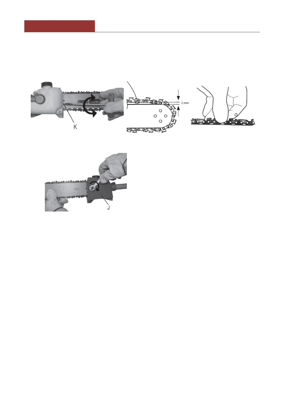 -Podesite stezanje lanca pomoću šarafa za stezanje lanca (stavka K). Okretanje šarafa u smjeru
