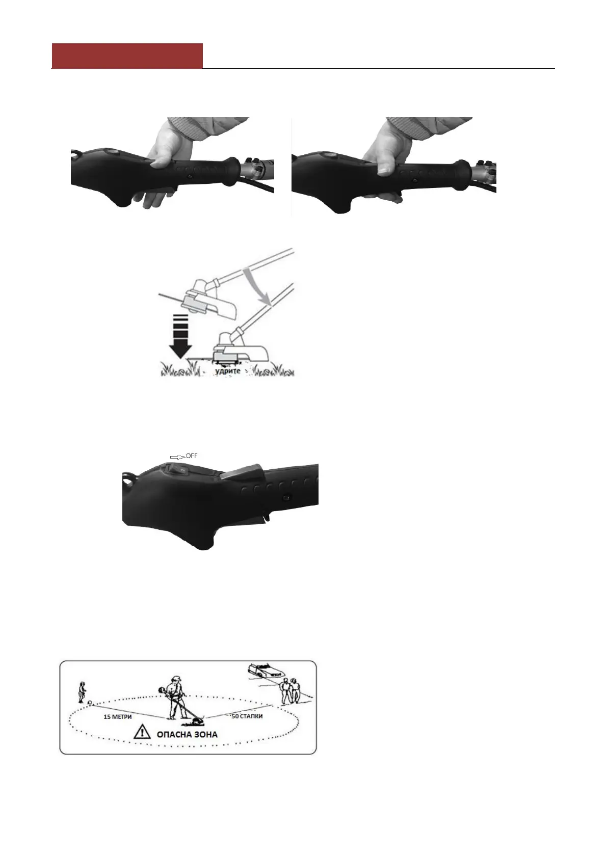 сечење. Силата на моторот може да ги отфрли предметите и малите камења на околу 15м и повеќе,