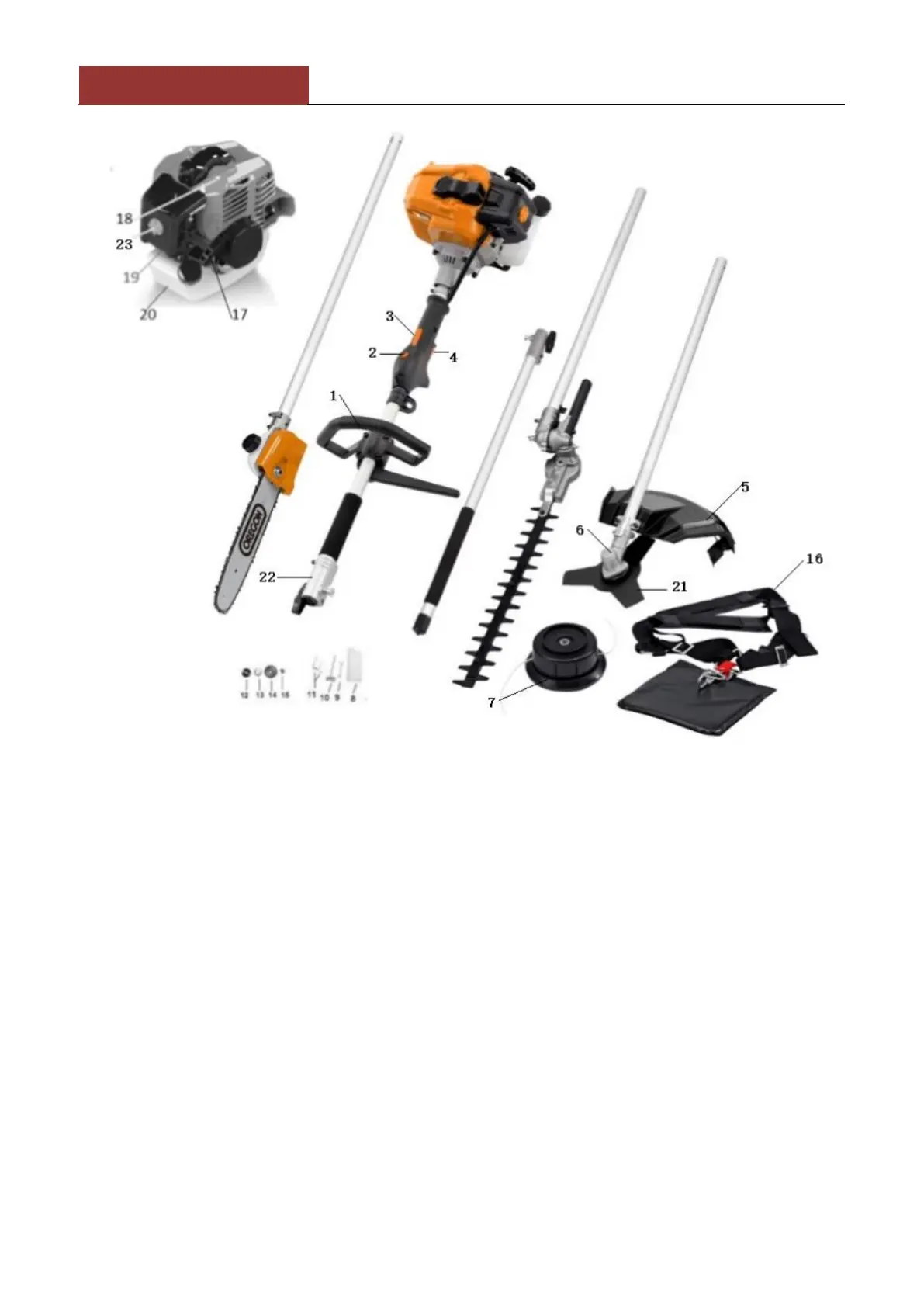 8. Nádoba na miešanie paliva a oleja 17. Spúšťač