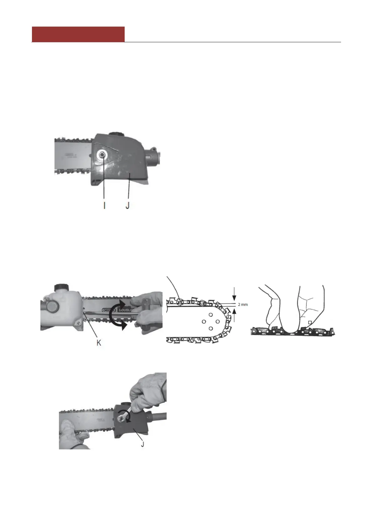 - Nastavte napnutie reťaze pomocou skrutky na napínanie reťaze (položka K). Krútenie skrutky