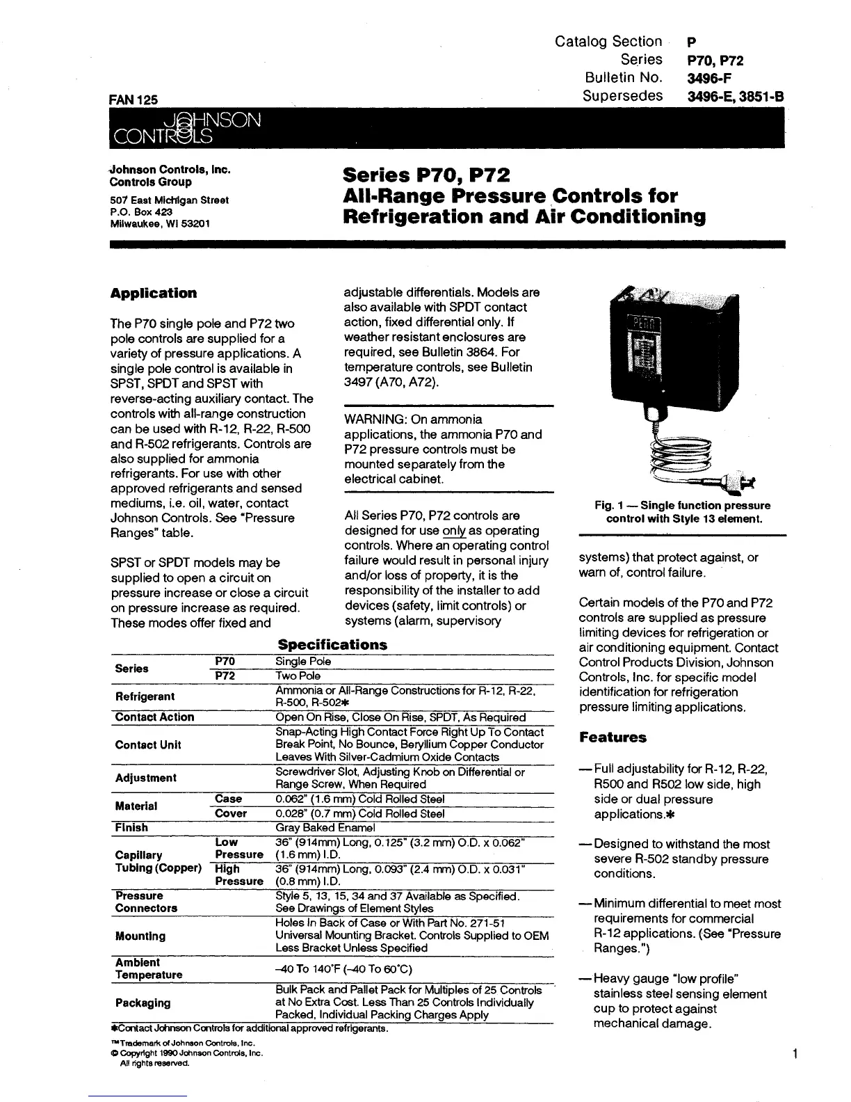 Vilter 320 - Johnson Controls Pressure Controls; Johnson Controls P70, P72 Pressure Controls
