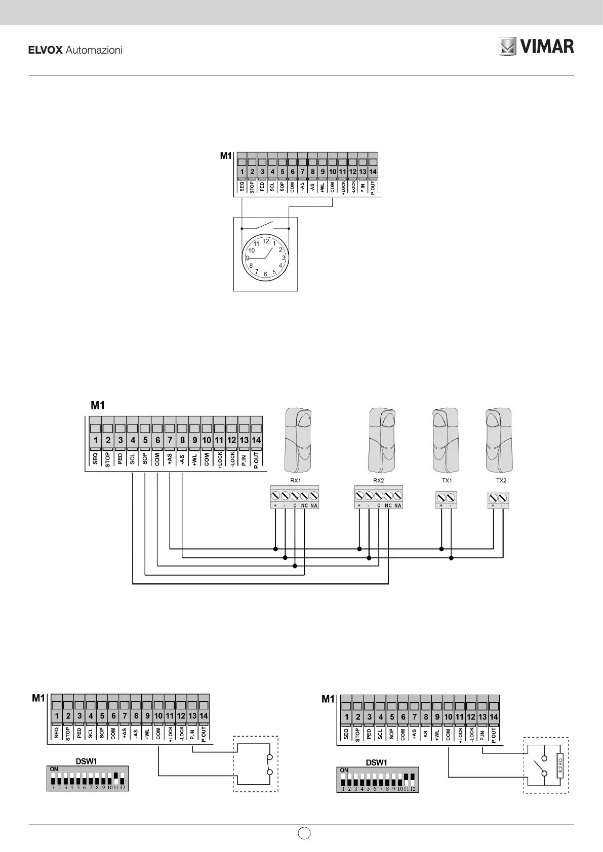 Con i Dip-switch 1 in ON (chiusura automatica attiva) e Dip-switch 4 in ON (funzione condominiale attiva), è possibile collegare un timer o un detector