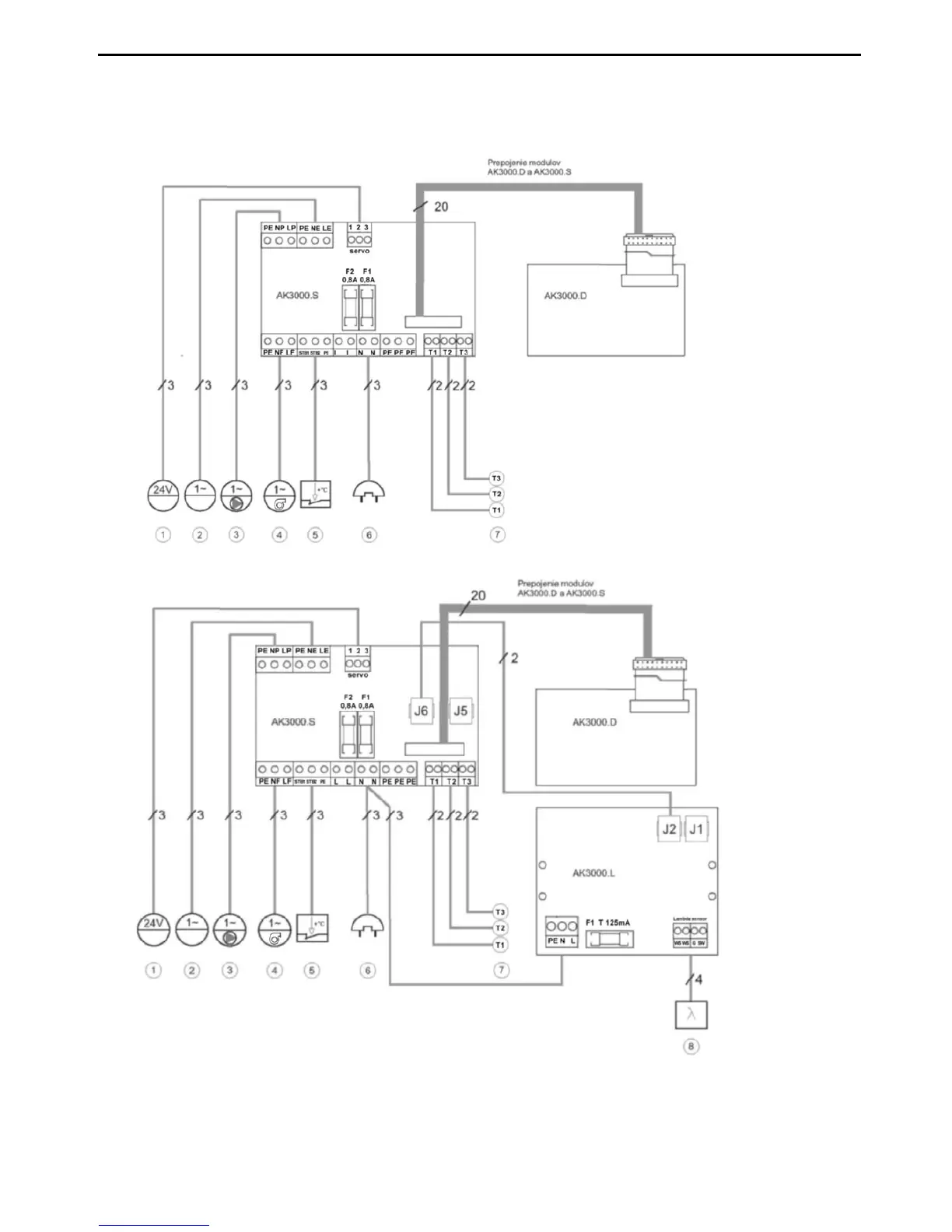 7. T1 Thermometer KTY, T2 Thermometer PT1000, T3 Indoor thermostat, no voltage, for hydraulic