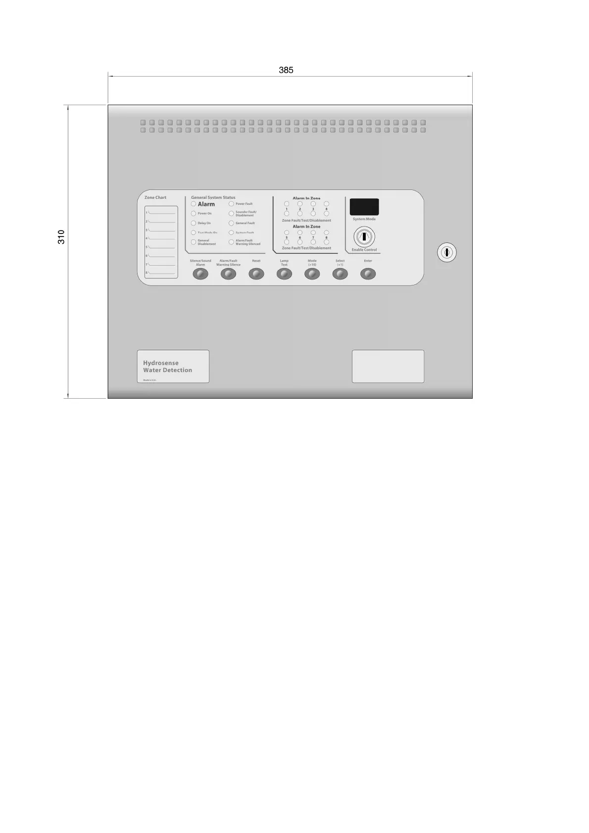 In addition to standard silence and reset controls, two, seven segment, LED displays and MODE, SELECT