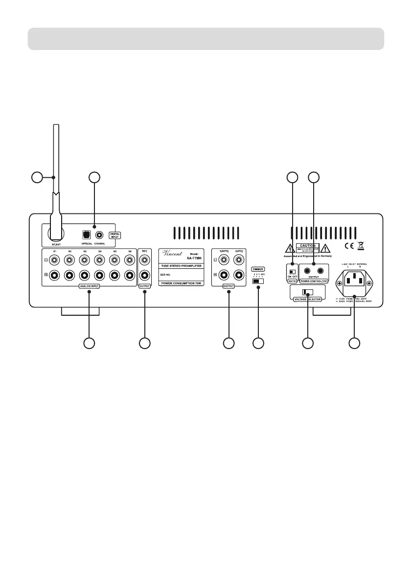 VINCENT SA-T7 MK - REAR VIEW; INPUT: input connectors; DIGITAL IN: Optical;Coaxial; OUTPUT: preamplifier outputs
