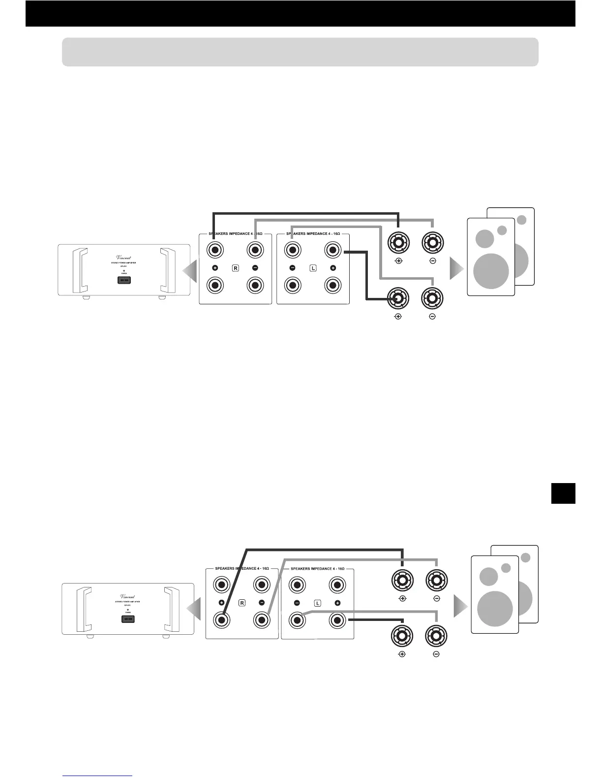 will be connected by each speaker cable wire: a knob marked “+” in the amplifier's terminal must be con-