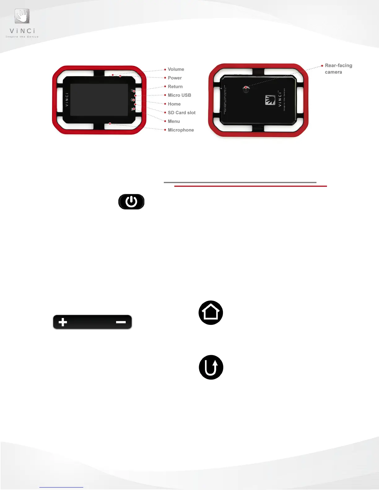 Use the Power button to turn your VINCI Tab on and off, reset and set to Sleep Mode