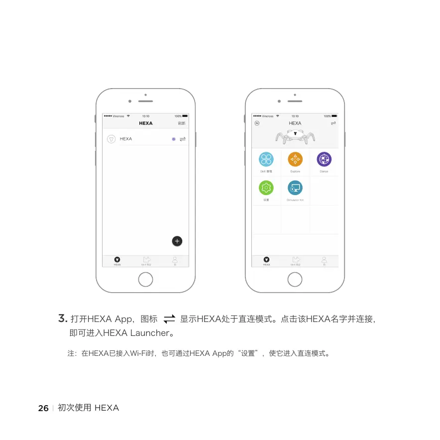 3. 打开HEXA App,图标 显示HEXA处于直连模式。点击该HEXA名字并连接,