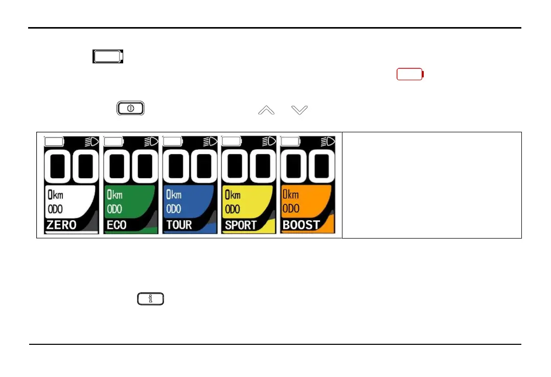 The level of assistance increases gradually in the following order ECO > TOUR > SPORT > BOOST, with ZERO mode