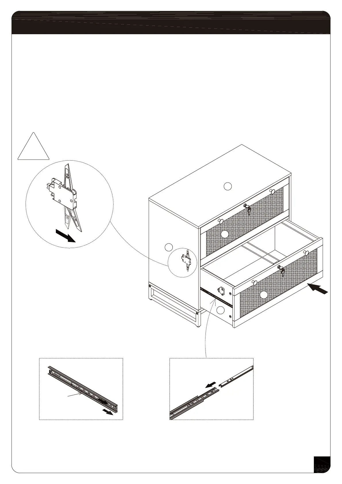 front; Keep the drawer level and insert the drawer with the slides