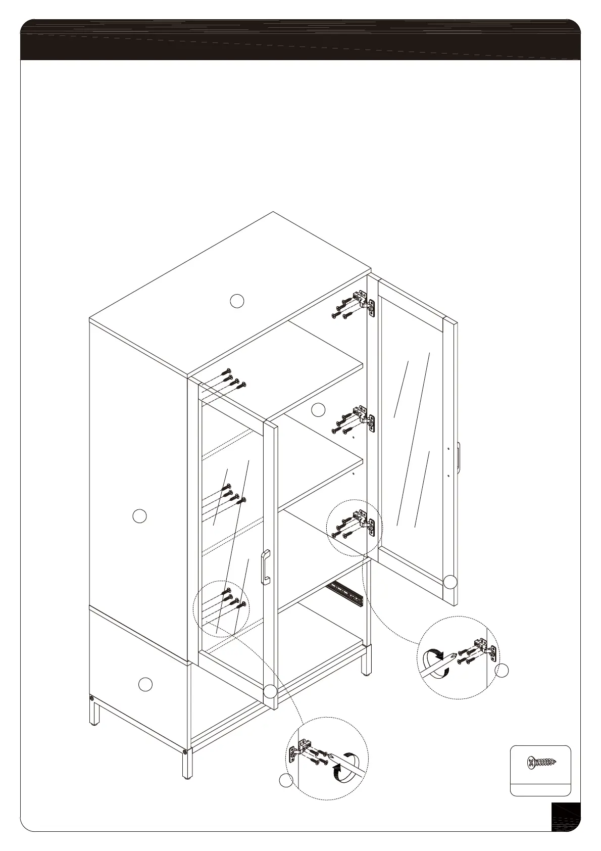 Fasten the door hinge to the cabinet with Screw(X). Adjust