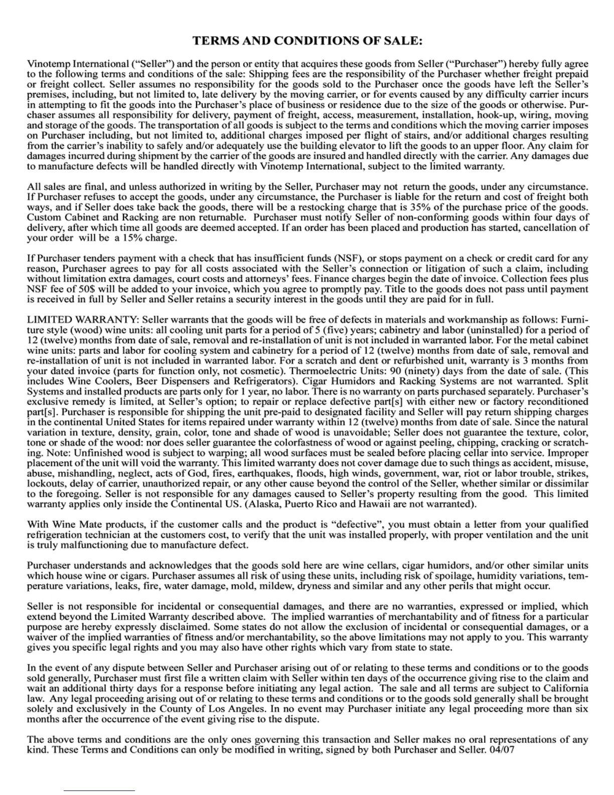 Vinotemp 100 - Terms and Conditions of Sale; General Terms and Shipping; Limited Warranty; Dispute Resolution and Governing Law