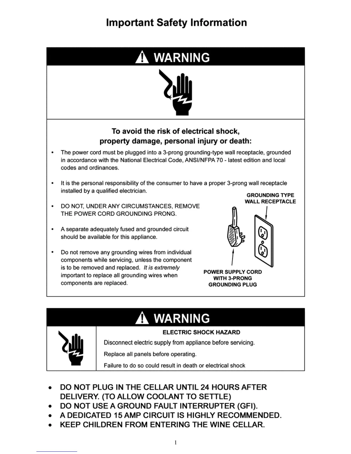 Vinotemp 100 - Important Safety Information; Electrical and General Safety Warnings